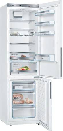 In de 3 transparante lades van de vriezer kun je 88 liter opslaan. De vriesruimte is uitgerust met LowFrost technologie en Supervriezen functie. Dankzij ingeschuimde verdampers is het ontdooien eenvoudig en snel. Dat betekent minder werk en lagere energiekosten. De 2.01 meter hoge Bosch KGE39AWCA heeft een BigBox-diepvrieslade: ideaal voor het stapelen van diepvriesdozen of voor grote diepvrieswaren. Bij stroomuitval blijven je producten nog minimaal 35 uur ingevroren.Bosch KGE39AWCA koel/vries combinatie
