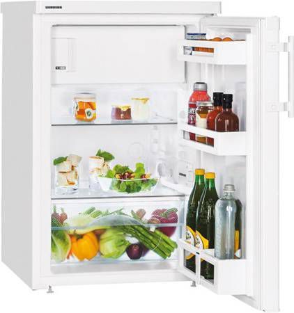Type: Tafelmodel met vriesvak Breedte: 50,1 cm Inhoud: 121 l De LIEBHERR TP 1424 22 is een tafelmodel-koelkast met vriesvak en een totale inhoud van 121 liter. De ruimte in het koelgedeelte is verdeeld over een groente- en fruitlade, twee schappen en drie deurvakken. Het onderste deurvak is geschikt voor het opbergen van grote flessen. Het vriesgedeelte, dat een bescheiden inhoud van 15 liter heeft, beschikt over CoolPlus. Hierdoor worden boodschappen extra snel ingevroren. Beschik je over beperkte ruimte om een koelkast neer te zetten? Het bovenblad is afneembaar en de draairichting van de deur is naar wens aanpasbaar. Verder staat de koelkast dankzij de verstelbare pootjes ook op ongelijke ondergronden stabiel. Dit zit in de verpakking: Tafelmodel met vriesvak, aansluitsnoer, 1 eierrekje, 1 flessen- en conserverenhouder, 2 draagplateaus en een gebruikershandleiding.